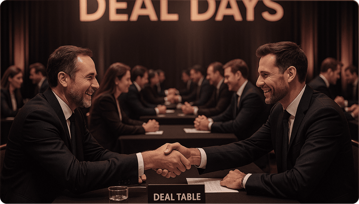 Ein Event, das auf nachhaltiges Dealmaking ausgerichtet ist. Bei den Deal Days kommen Mitglieder und ausgewählte Gäste zusammen – Unternehmerinnen und Unternehmer, deren Produkte und Dienstleistungen sich sinnvoll ergänzen. In Formaten wie Deal Tables, Business Speed Dating und kompakten Präsentationen entstehen Gespräche, die neue Chancen eröffnen. Am Ende der Deal Days steht eine stilvolle Aftershow-Party.